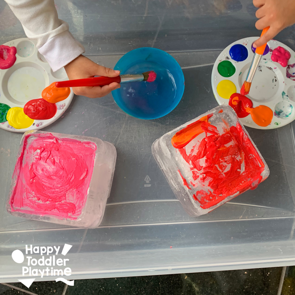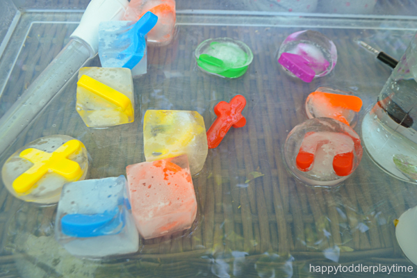 Add ice cubes to a water table along with kitchen utensils for imaginative cooking play.