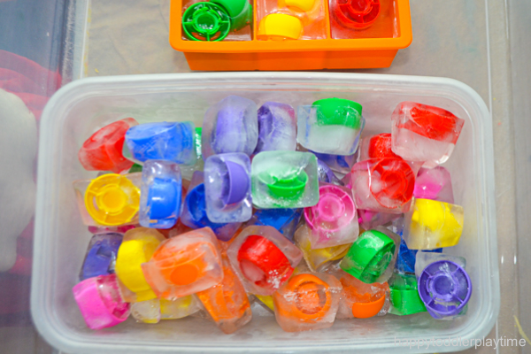 Freeze bottle caps in water for small-scale sensory play and sorting activities.