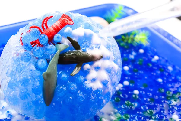 Create an ocean-themed bin with blue ice cubes and sea creature toys for imaginative play.