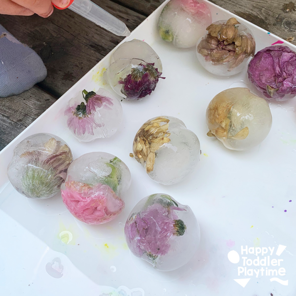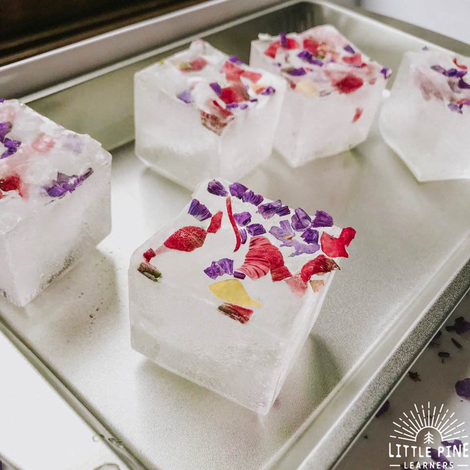 Freeze flower petals in ice cubes for a fragrant and colorful sensory activity.
