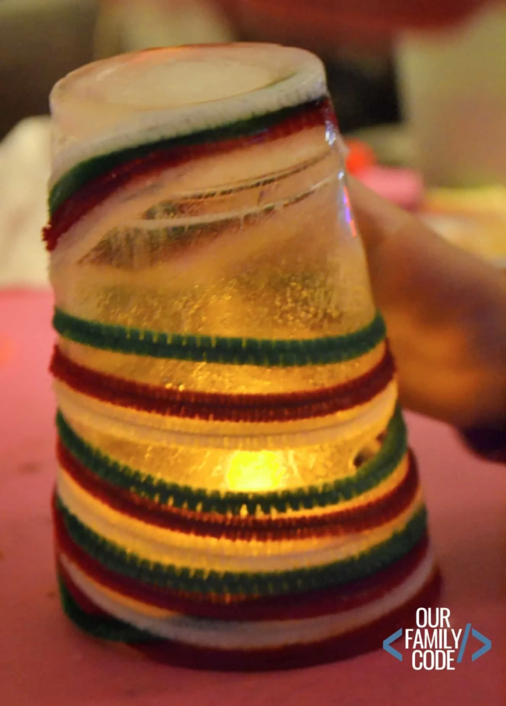 Create decorative lanterns by freezing water in molds with added decorations, then place a light inside.