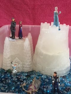 Inspired by the movie, create a bin with icy elements and Frozen-themed toys for imaginative play.
