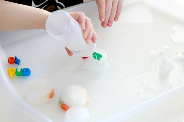 Freeze magnetic letters in ice and let kids melt them to reveal the alphabet, combining sensory play with literacy learning.