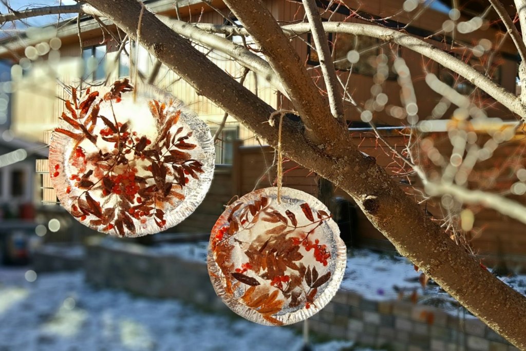 Freeze water with decorations in molds and hang them outside as temporary ornaments.