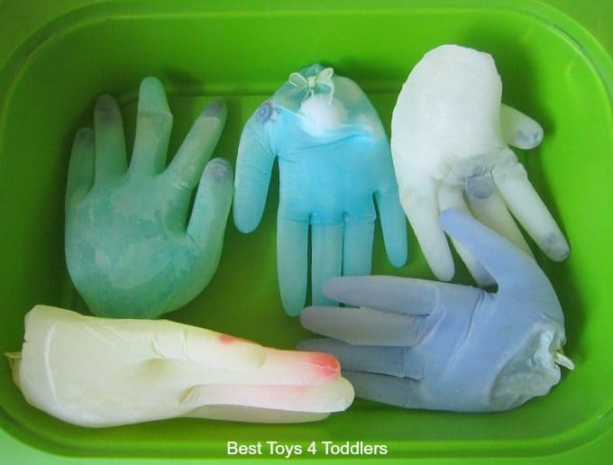 Freeze water in glove molds to create icy hands. Kids can explore the shapes and sensations as they melt.