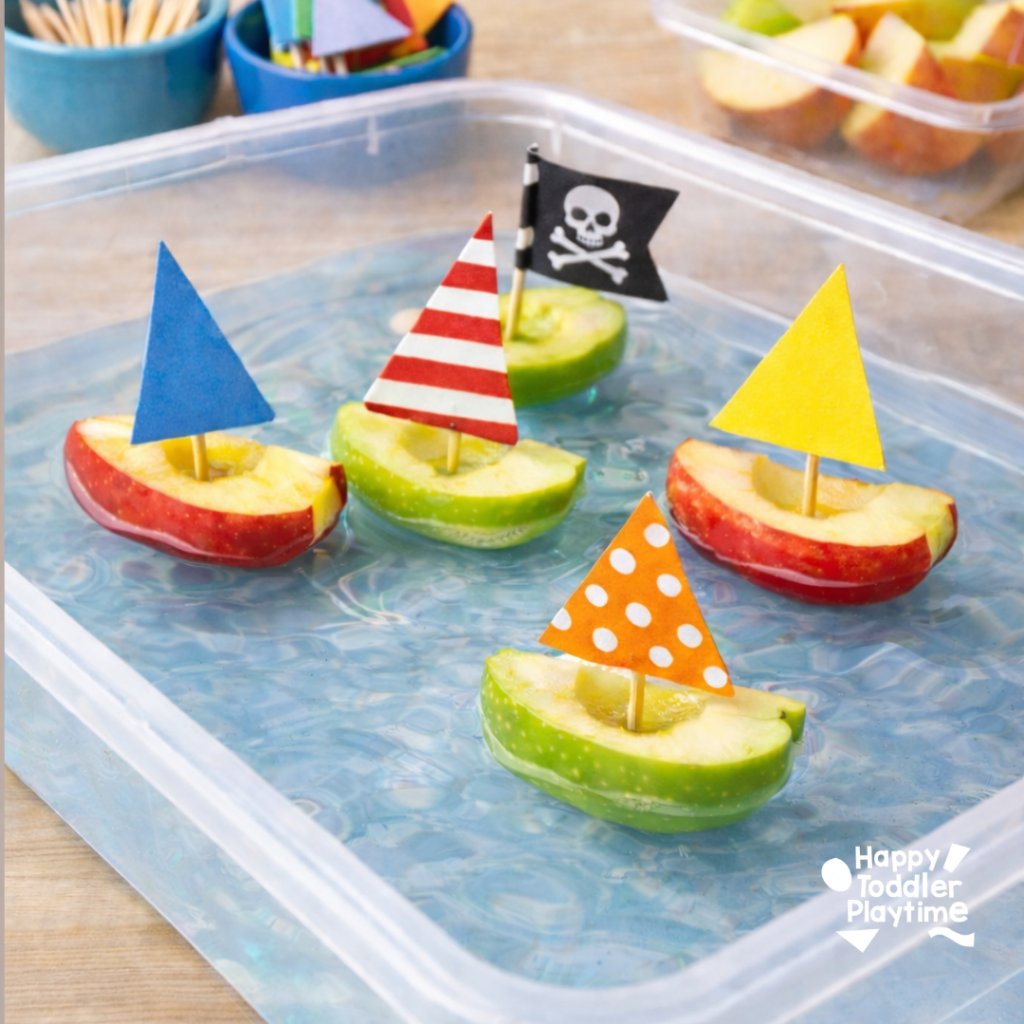 - Slide the toothpick through the sail to make a mast. Push the toothpick into the apple.