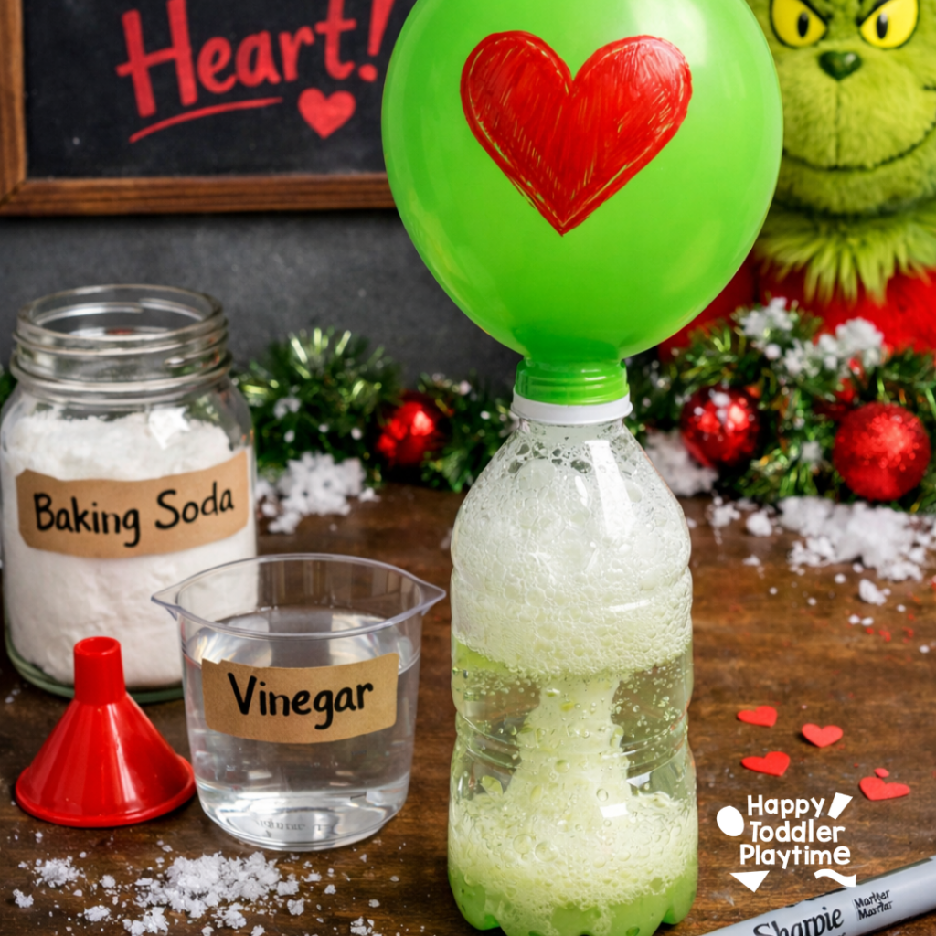 This fun and simple science activity shows the Grinch’s heart “growing” right before your eyes! Kids love watching the balloon expand as the fizzy reaction happens inside the bottle.