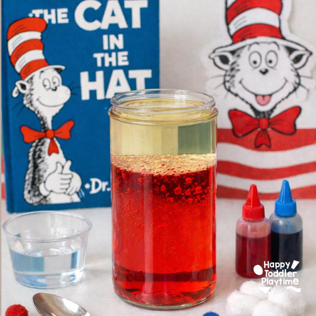 This simple science experiment is inspired by the Cat in the Hat’s red and white stripes. Kids get to see how oil and colored water don’t mix — and how they naturally form layers!