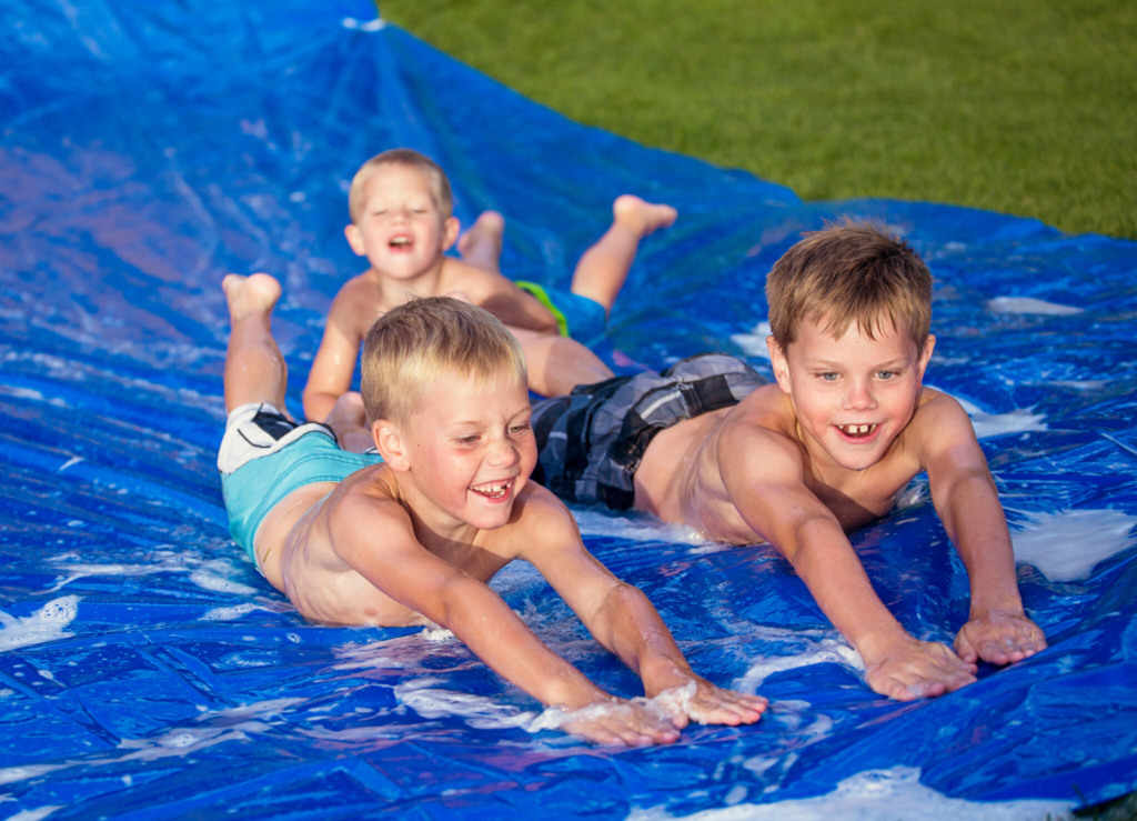 Lay a tarp on a sloped area, spray with water, and add a little baby shampoo for extra slip. Supervise closely!