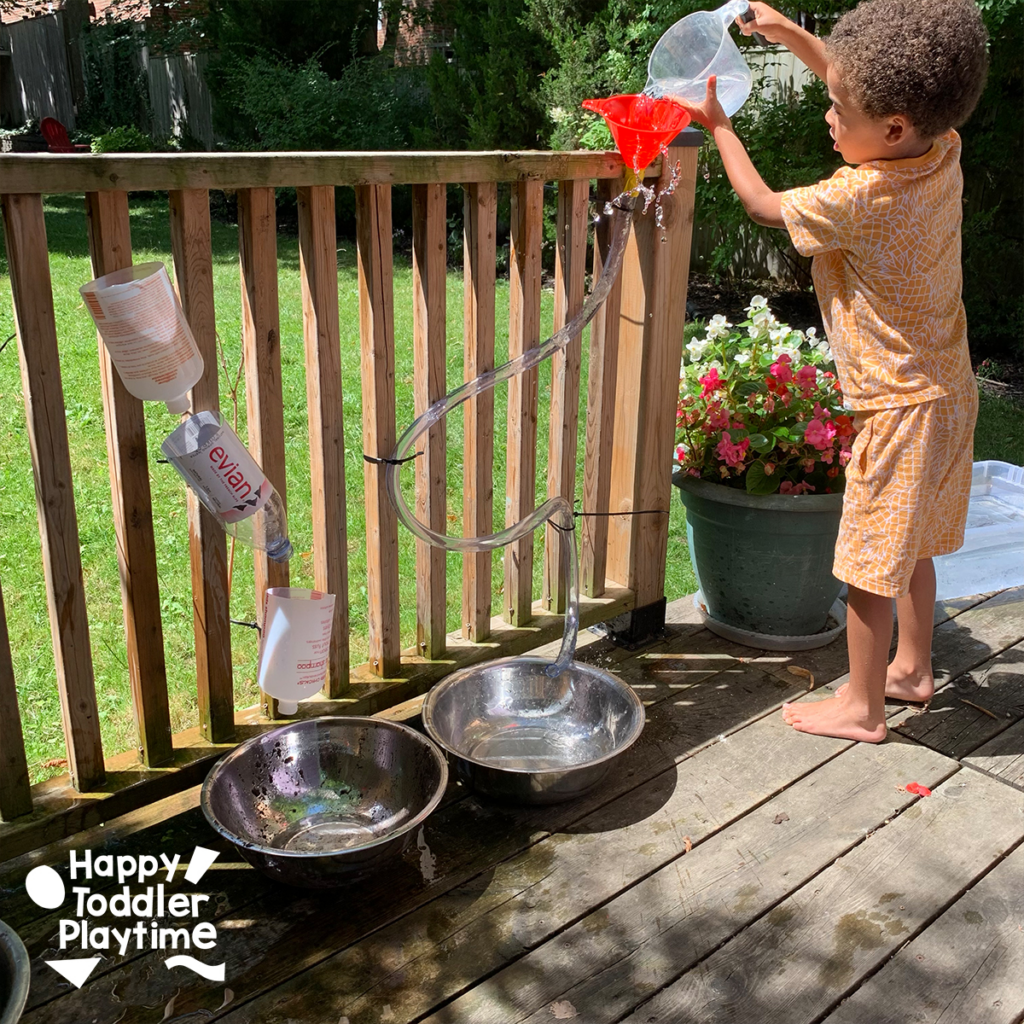 Cut and attach bottles and funnels to a fence to make your own water flow system. Provide cups or pitchers to pour.