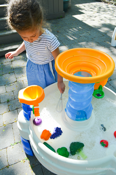 Set up a pretend kitchen in your water table where kids can mix, stir, and “serve” their own watery recipes.