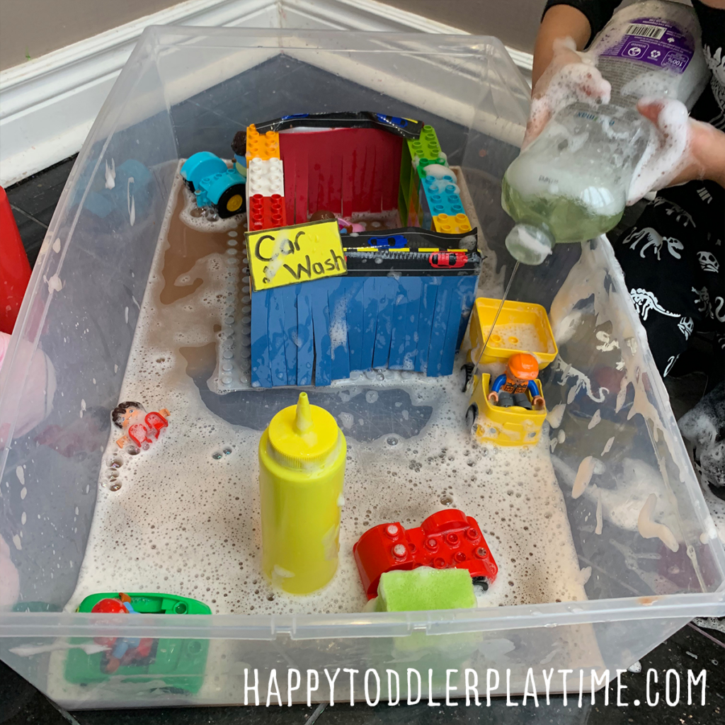 Set up a wash station with soapy and clean water bins. Let kids scrub their toys and run them through a “car wash.”