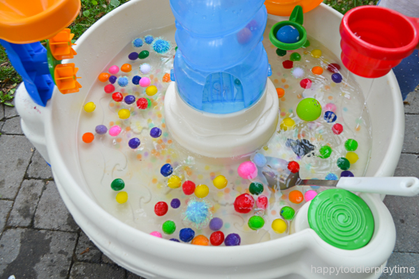 Toss pom poms into the water and invite kids to scoop, sort, and pour.