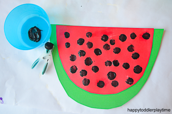 Attach pom-poms to clothespins to create stampers. Cut and glue a watermelon shape from green and a slight smaller one from red construction paper. Dip in paint and stamp onto the red construction to make watermelon seeds.