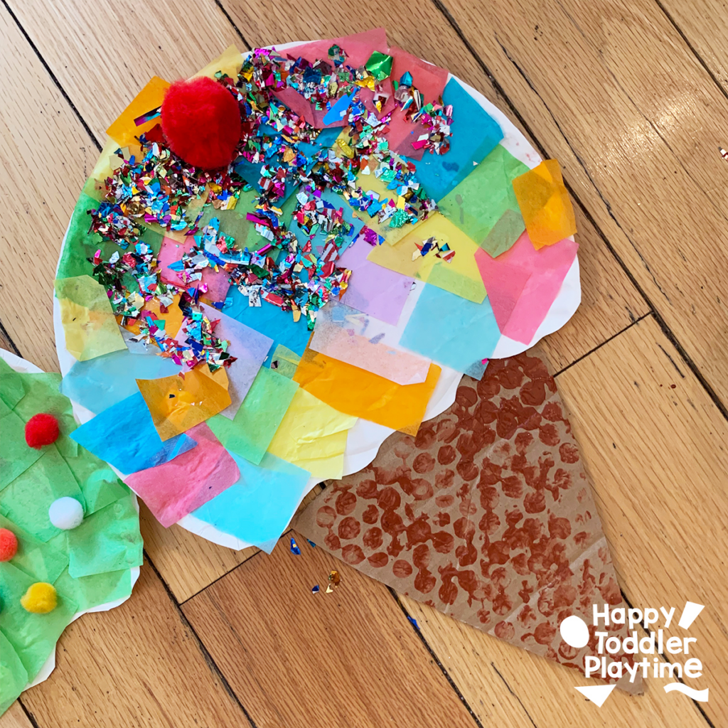 Cut a paper plate into an ice cream shape. Use tissue paper, Pom Poms and glitter to decorate the ice cream. Cut cone shape from cardboard. Use bubble wrap and brown paint to decorate