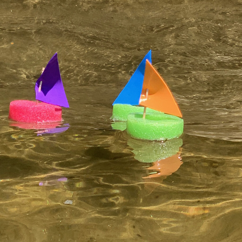 Stick a craft stick into the sponge, tape on a paper sail, and launch in water. Great for bathtub or backyard water table fun.