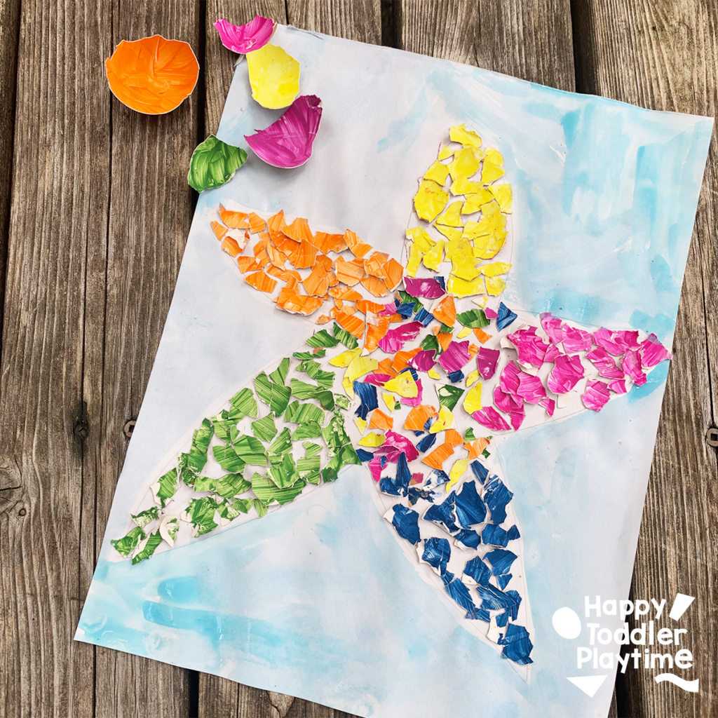 Crack the eggshells into small pieces and set them aside. Draw or print a simple starfish outline on sturdy paper. Have kids glue on eggshell bits to fill the shape, then paint over the shells in bright ocean-inspired colors.