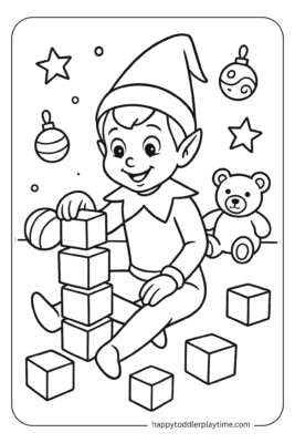 - Add Them Into an Elf Adventure Scene: Color and cut out the elf from the page and stage it in a new silly spot each morning — climbing the cereal boxes, hiding under a pillow, or riding a toy car. One printable = days of fun!