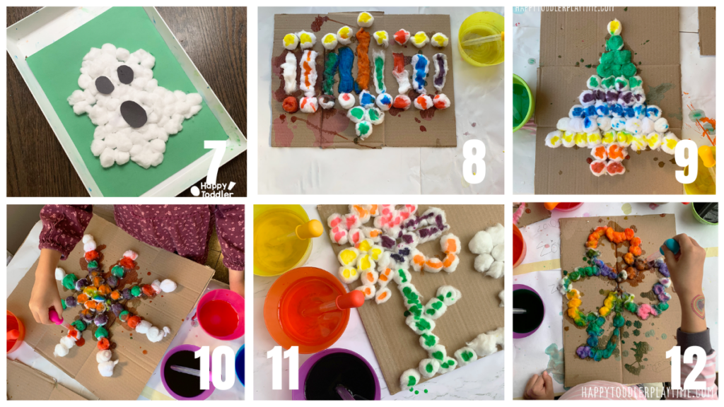 Turn cotton balls into “snowballs” and arrange them to spell out your child’s name. This combines name recognition with a wintery sensory craft.