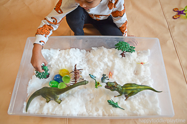 Do your little ones love dinosaurs? If your answer was do birds fly?, check out this fun snow dinosaur sensory bin that incorporates their favorite dinosaur toys! Combine them with snow for this fun and easy snow dinosaur sensory bin!