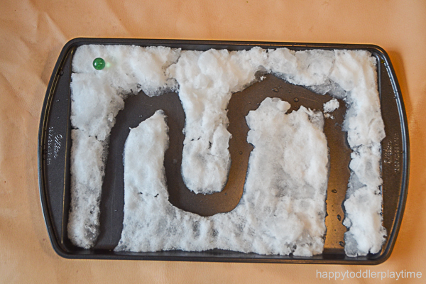 - I used a small spoon to create a maze in the snow. First I used the spoon handle to carve it out in the snow. This part can be a bit tricky (especially if you are indoors). Some parts of the maze may start to crack as you create a path, if this happens just grab the snow you dug out and patch up the crack! Its tricky but the fix is easy!