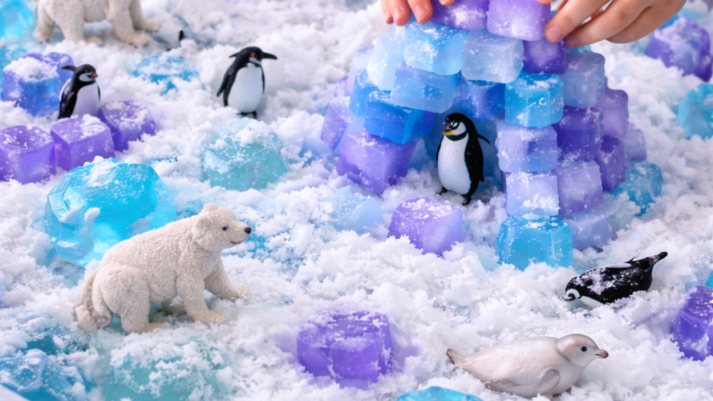 - Once frozen, add the ice cubes to your sensory bin. Scatter snow gathered from outside around the ice to create a base for building. Nestle the animals into the bin so they’re partially buried or “waiting” to explore. This small detail immediately draws kids into the play.