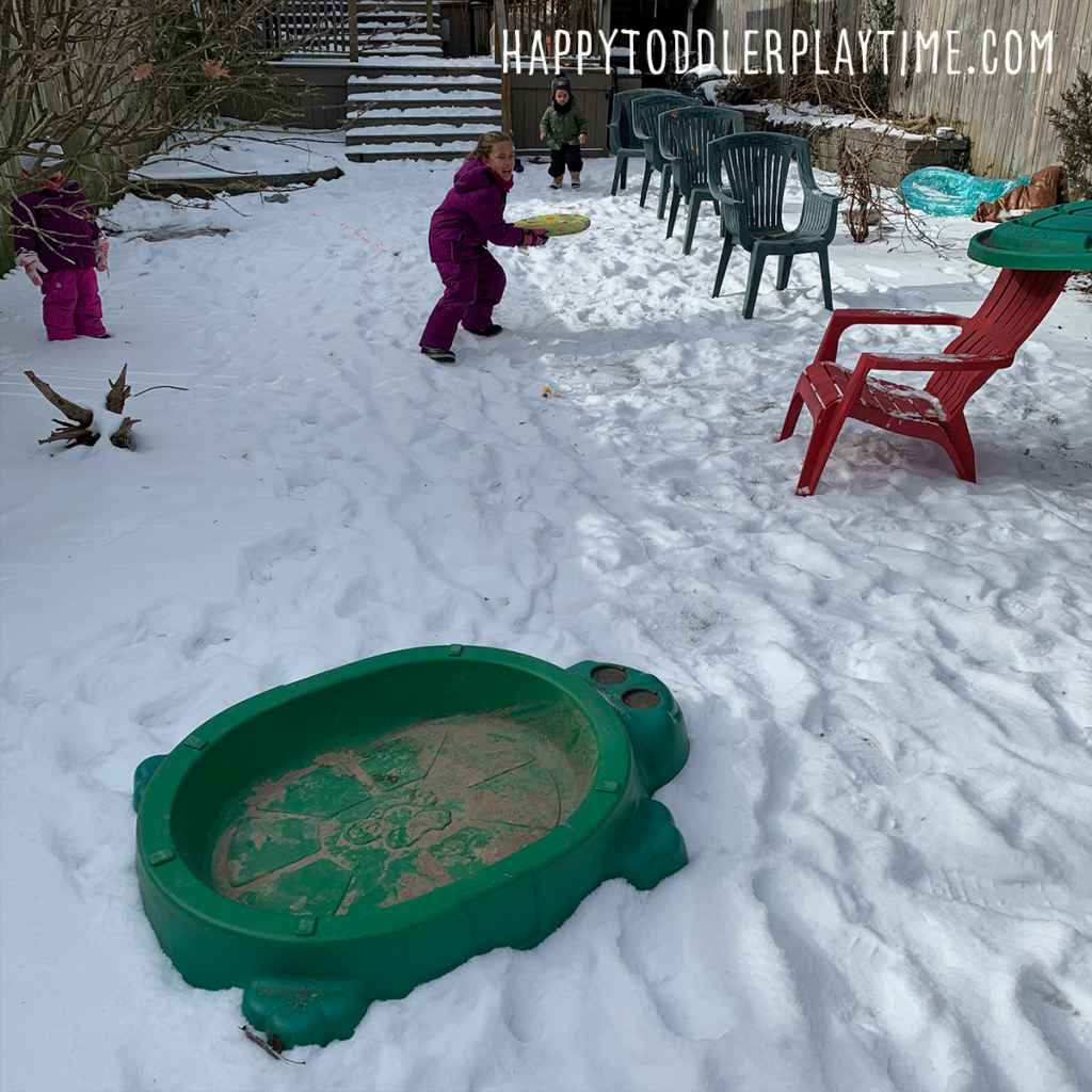 - The possibilities are endless! We unfortunately didn’t a ton of snow at the time of us doing this obstacle course. So instead I used some other items that we had in our backyard such as plastic toys and chairs and sticks!