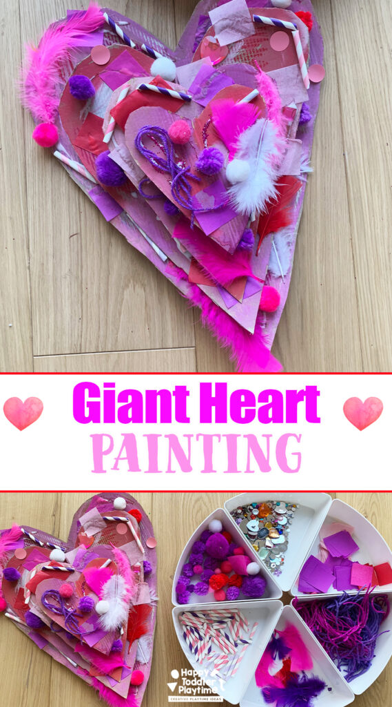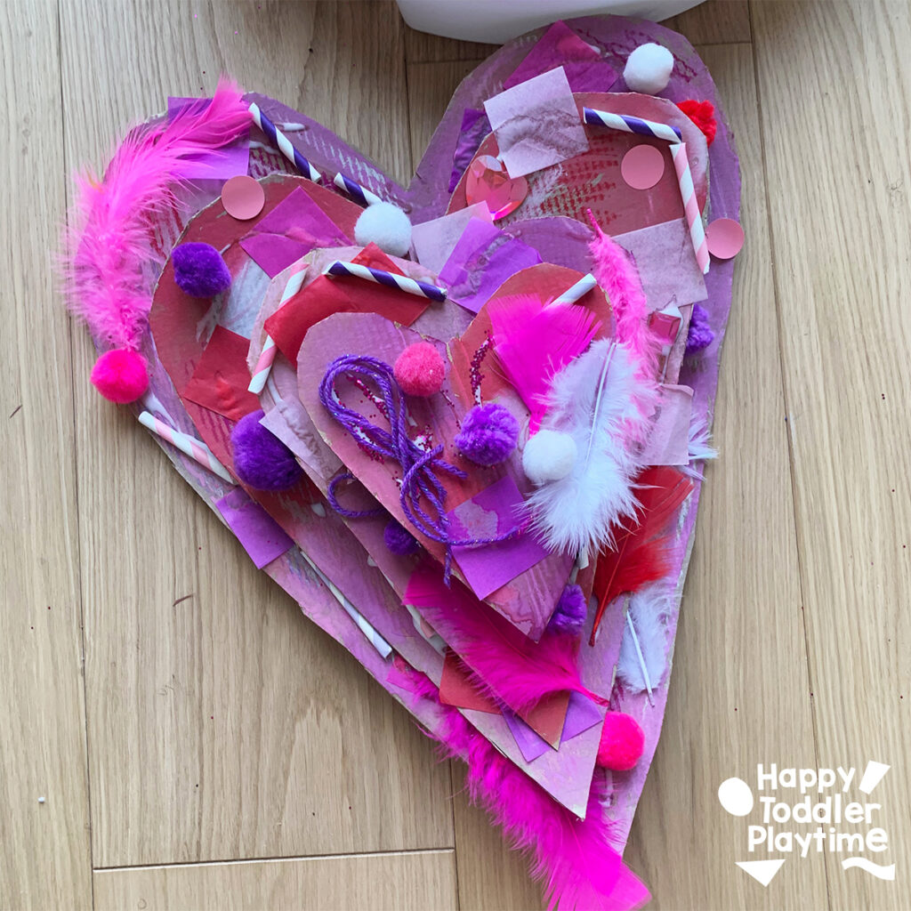 - Decorate the Hearts: Using watercolor paint and oil pastels, color each heart in shades of pink, red, or purple. Once the paint dries, get creative with decorating! Glue down pieces of tissue paper, foam shapes, straw pieces, pom-poms, and sprinkle some glitter to add texture and sparkle. Feel free to mix and match the decorations for each heart.