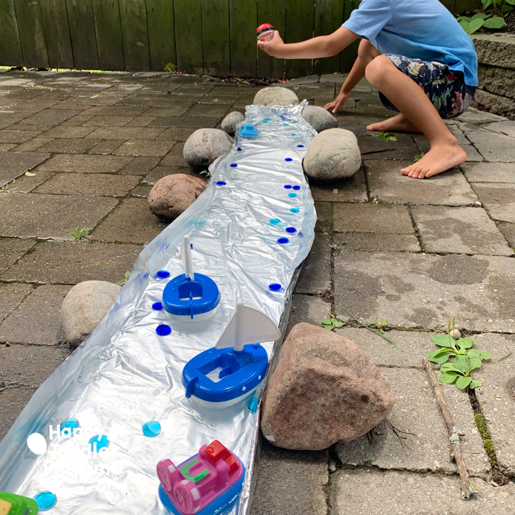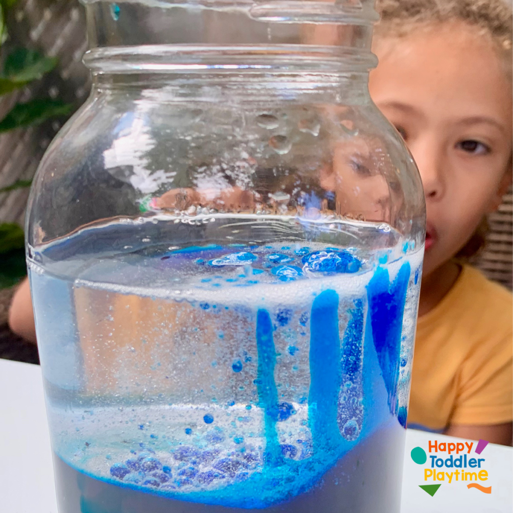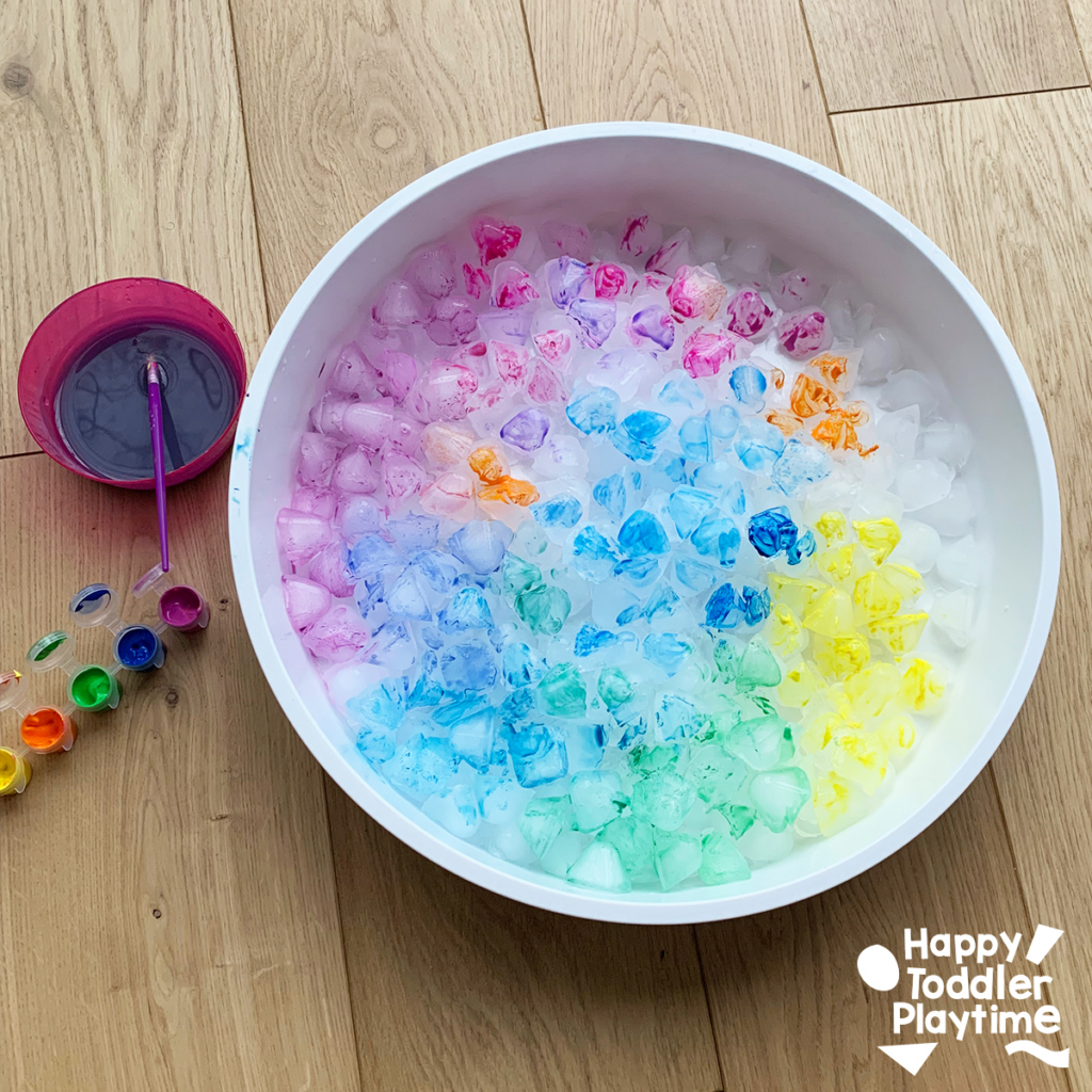 Pour ice into a sensory bin. Sprinkle it with baking soda. Set up a tray with vinegar, food coloring and droppers—let your child squeeze vinegar onto the ice and observe the fizzy magic!