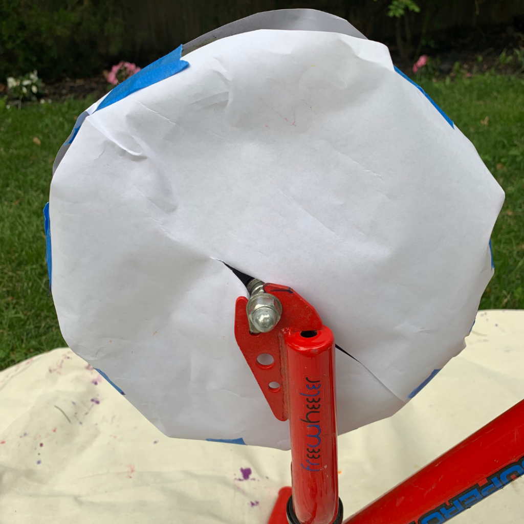 If you are painting with the bicycle lying flat on the ground you can squeeze paint on the paper while spinning it creating a cool pattern! I found it helpful to have the wheel slightly raised on something to help it spin smoothly. We rested it on a mixing bowl turned upside down.