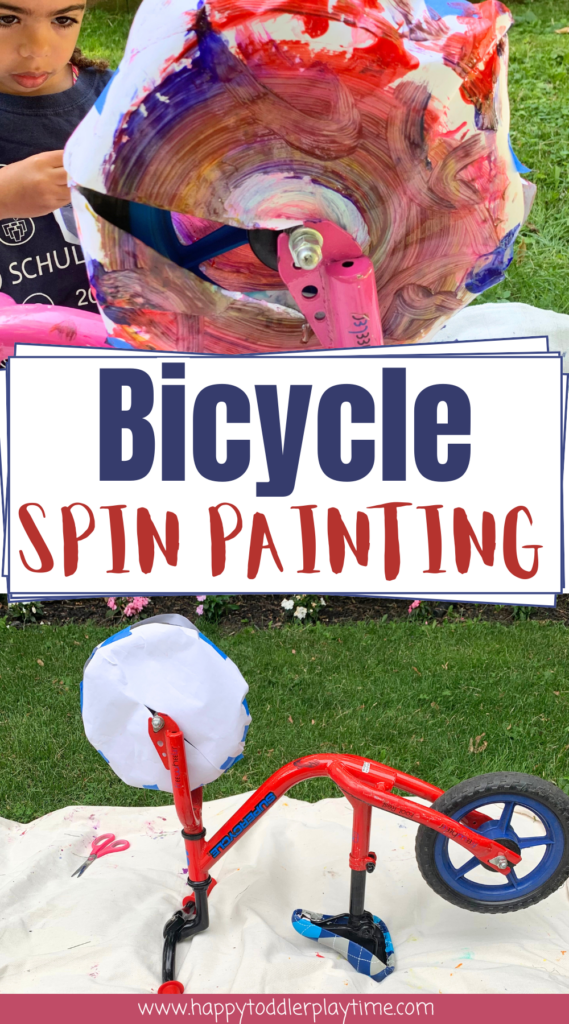 This is the best part. If you are painting with the bicycle upside down, have them add the paint using a paint brush while spinning the wheel. They can stick to primary colors so that they can mix and create new colors as they spin.