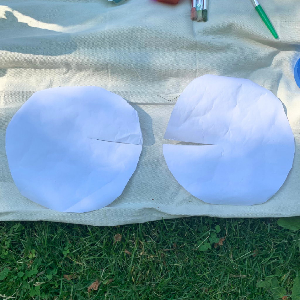 Hold a sheet of butcher paper on the wheel and trace the rough size of the wheel on it. Cut it out and then cut a slit to the middle of the circle. You can cut out serval circles depending on how many times your kids want to paint. Attach the circles to the front tire using painter’s tape. You want to make sure to secure it so that the wheel can still spin freely.