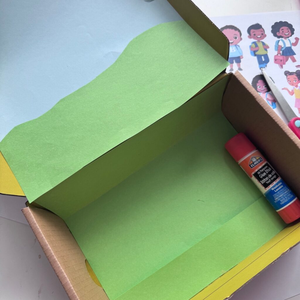 - Start off with an empty shoebox. You can either paint the inside bottom green for grass and the top blue for sky or do what we did and cut and glue pieces of green and blue construction paper on the bottom and top. We also cut out a hill from green construction paper glue it to the bottom of the sky.