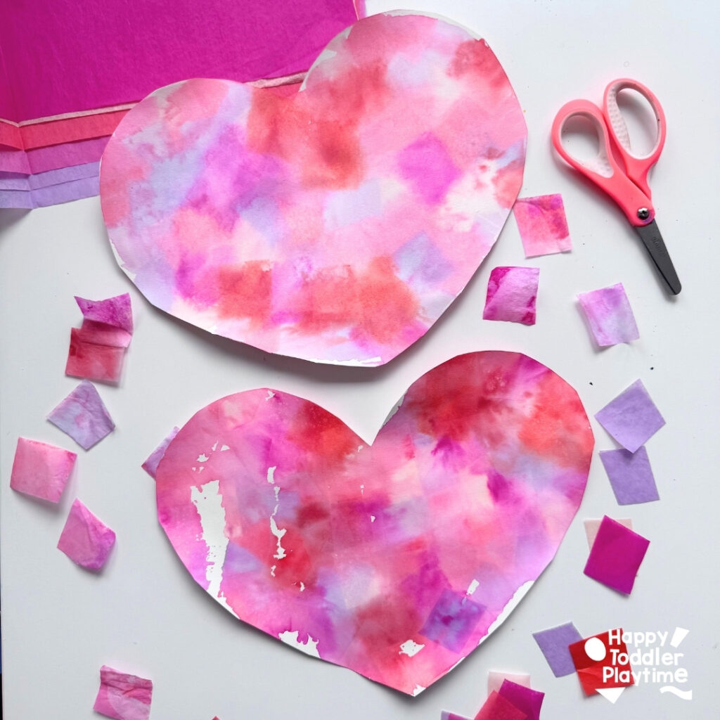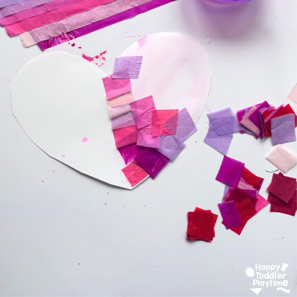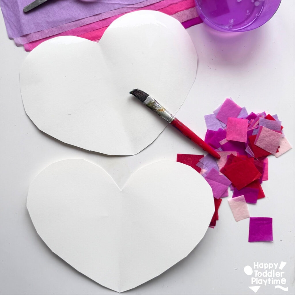 - Using the paint brush, apply a thin layer of water to the heart-shaped cardstock. Lay the tissue paper pieces on the water in the water. The water will help keep the tissue paper in place. Cover the entire heart with the tissue paper, applying water and layering the tissue paper it as you go. Once the entire heart is covered, dip your paintbrush in water and gently brush over the tissue paper with the water. As the tissue paper gets wet, the colors will start to bleed and blend together.