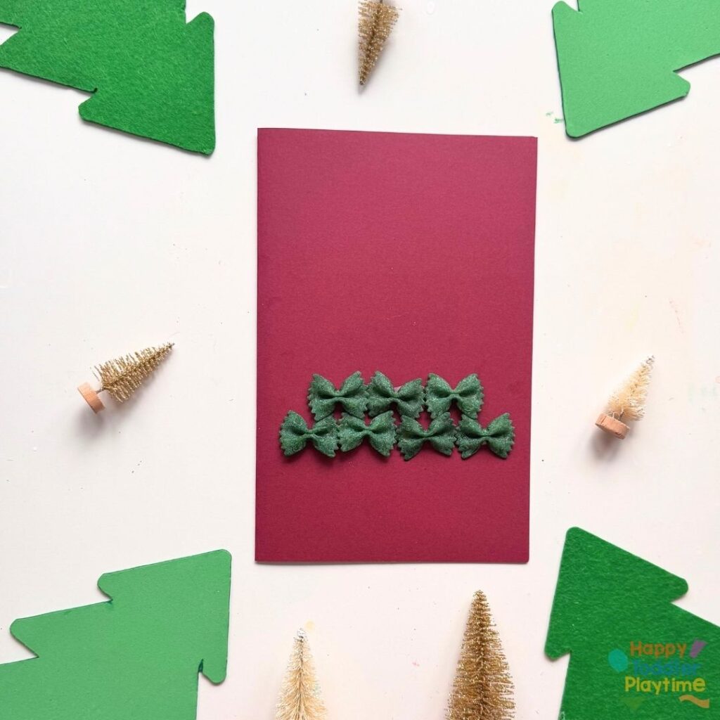 Lay out the green bow tie pasta on the card in a triangular tree shape, starting with four pieces at the bottom and decreasing the number of pasta pieces in each row as you move up. This will help kids plan their design before gluing.