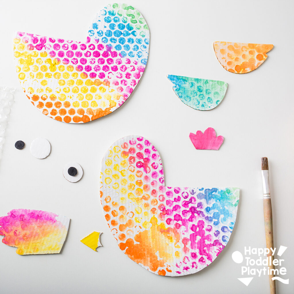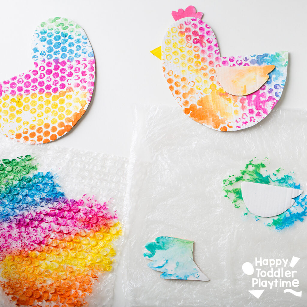 - Bubble Wrap Painting: Lay out a sheet of bubble wrap and apply paint in various colors. Press the cutout shapes for the chick's body, wings, and tail onto the painted bubble wrap, ensuring each piece is coated with paint. Apply the paint to one side of each piece so that they can be glued back-to-back, creating a decorated chick visible from both sides. Paint the beak yellow and the top plumage red, then set all pieces aside to dry.