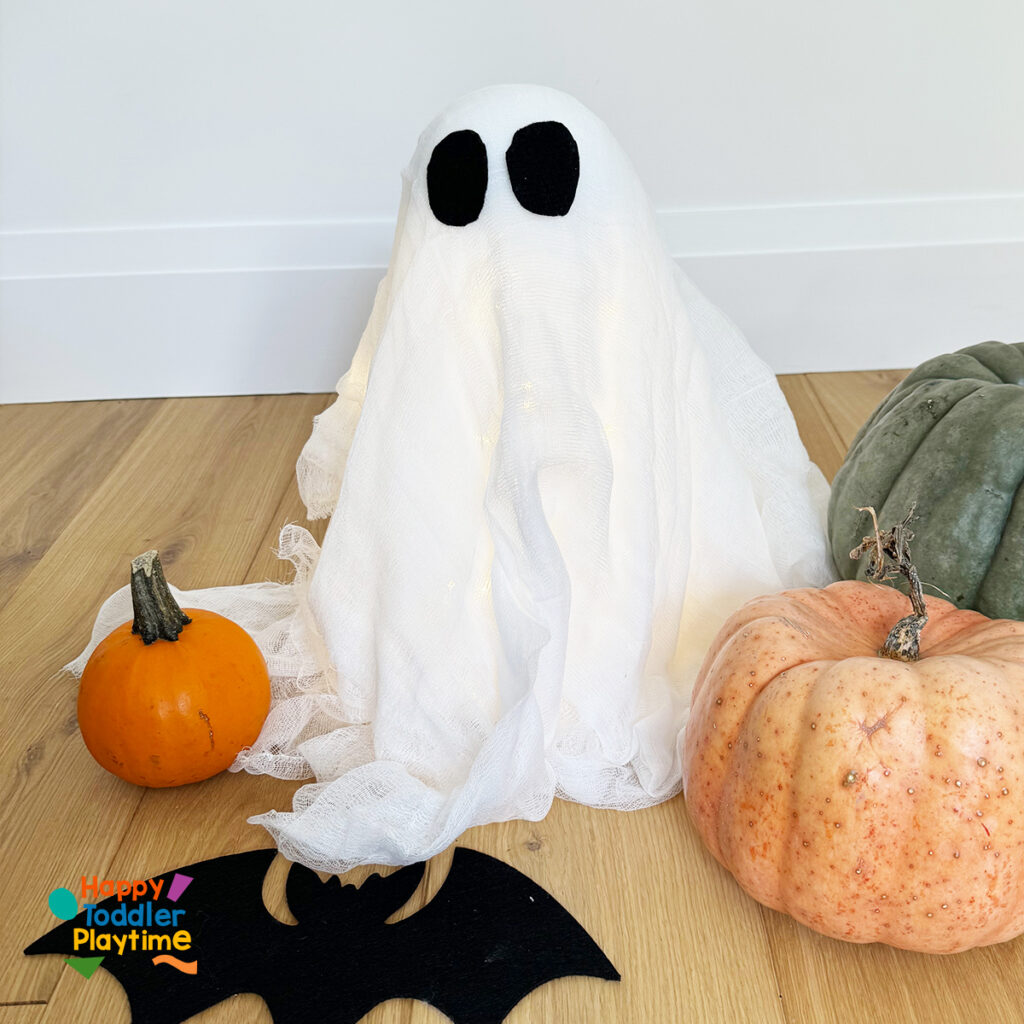 Place your cheesecloth ghost on a table, hang it with a string, or set it up outside for a glowing Halloween decoration.