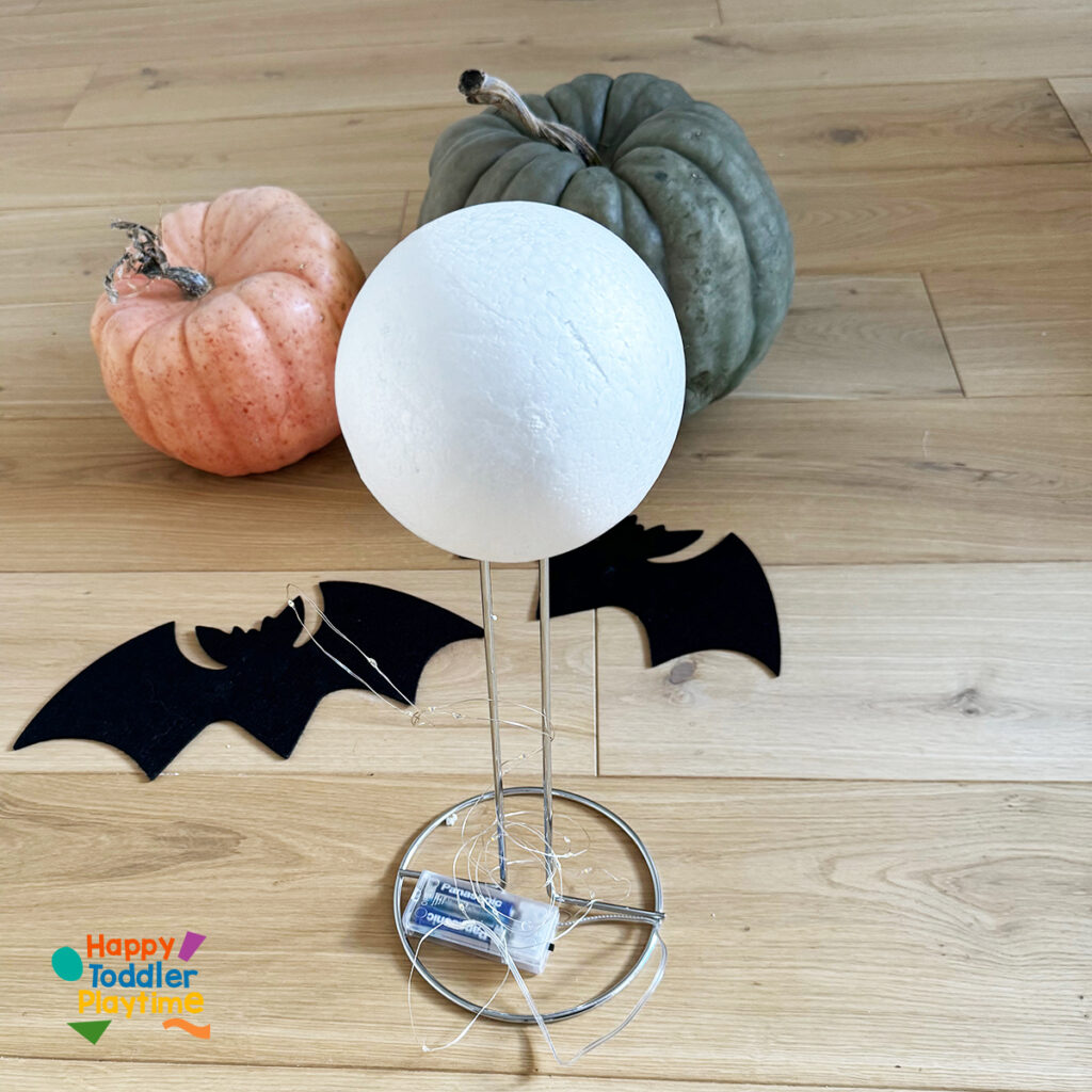 Wrap fairy lights around the paper towel roll holder. You can tape to secure the end of the lights to the styrofoam ball.