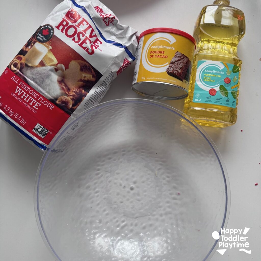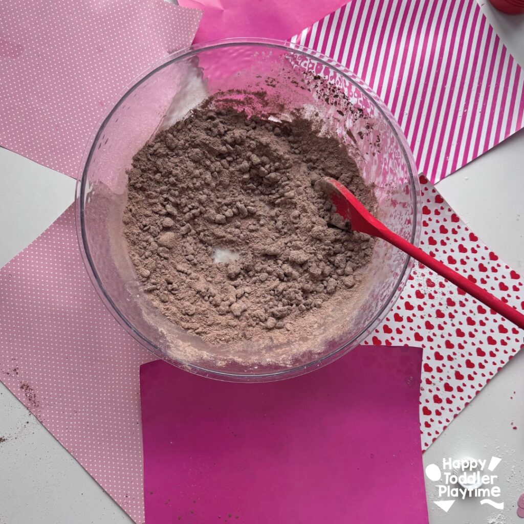 - In a mixing bowl, combine 2 cups of flour, ½ cup of cocoa powder, and ½ cup of vegetable oil.