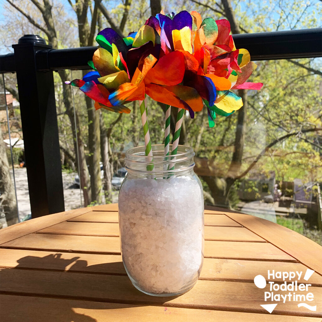 - To display your flowers, grab a mason jar and fill it with rock salt or any other stable material to anchor your creations. Insert the stems of your coffee filter flowers into the jar. You now have a vibrant, cheerful bouquet that’s perfect for Mother’s Day or as a lovely springtime decoration.