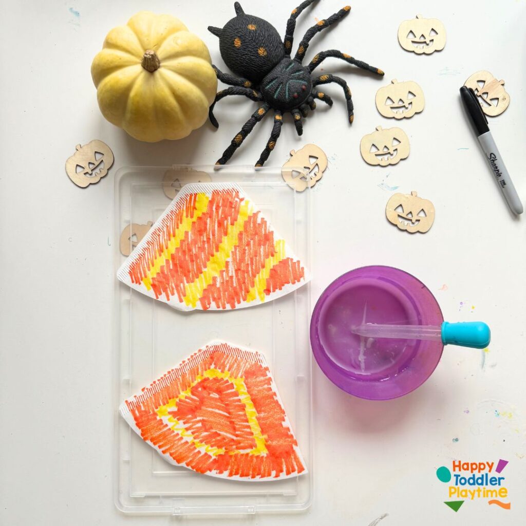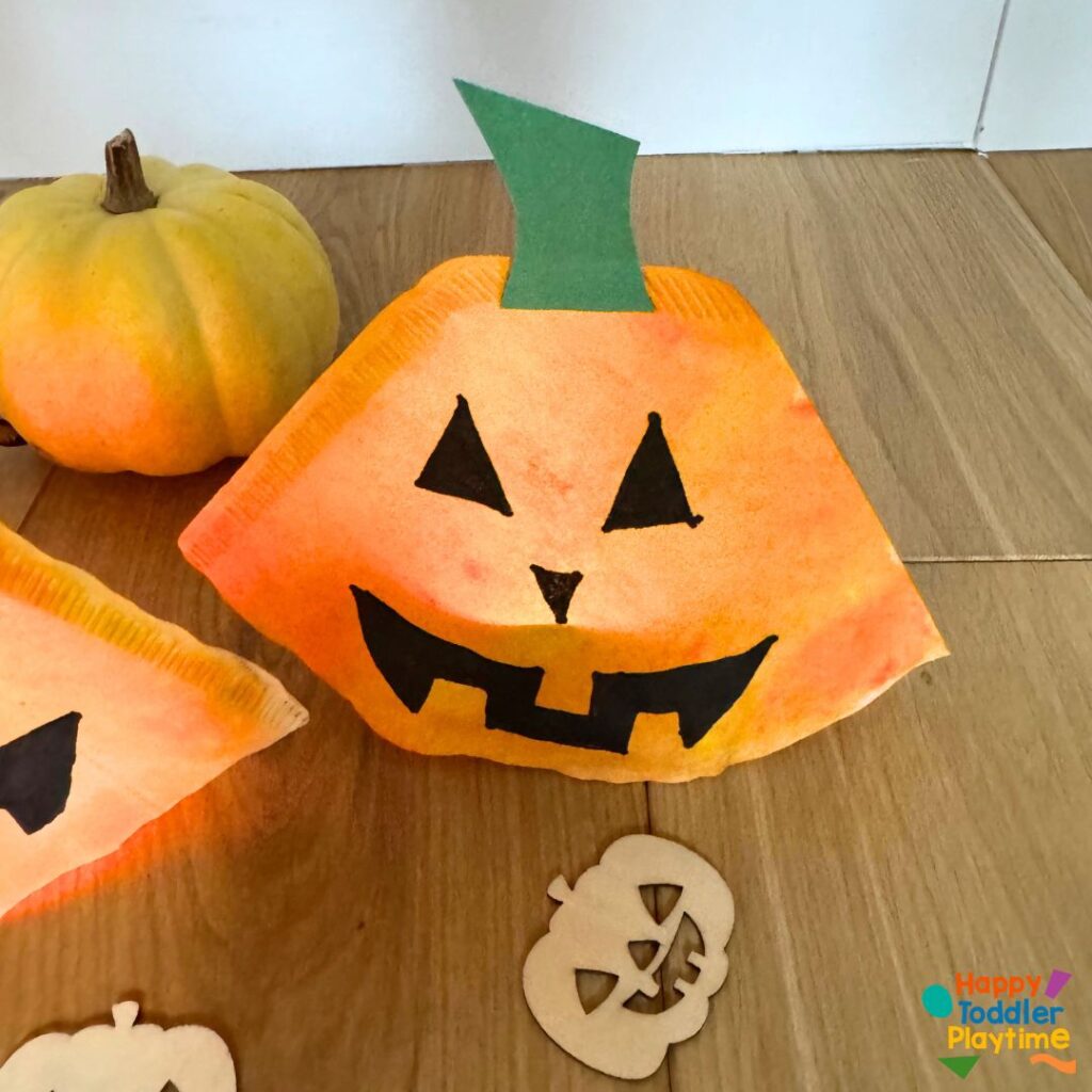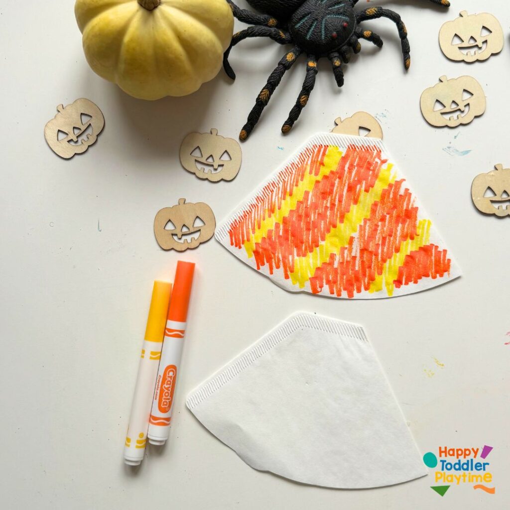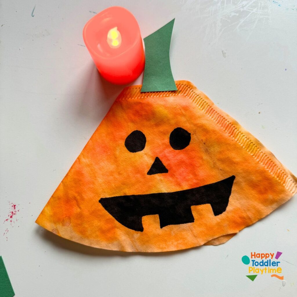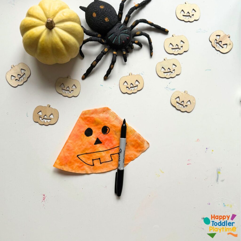 Using a black marker, draw a classic pumpkin face on the colored coffee filter. Encourage your child to make it silly, scary, or happy—whatever they like! The cuteness is in the creativity here.
