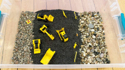 There’s something irresistible about a construction site for my kids—the giant machines, the bustling activity, and the transformation of landscapes. When I put this sensory bin together I knew it would be a hit but this bin was a bit more than that. They played with this bin for days! They kept coming back to it over and over again, creating new stories and plots. It was so simple but incredibly engaging! I is easily one of my favorite bins of all times!