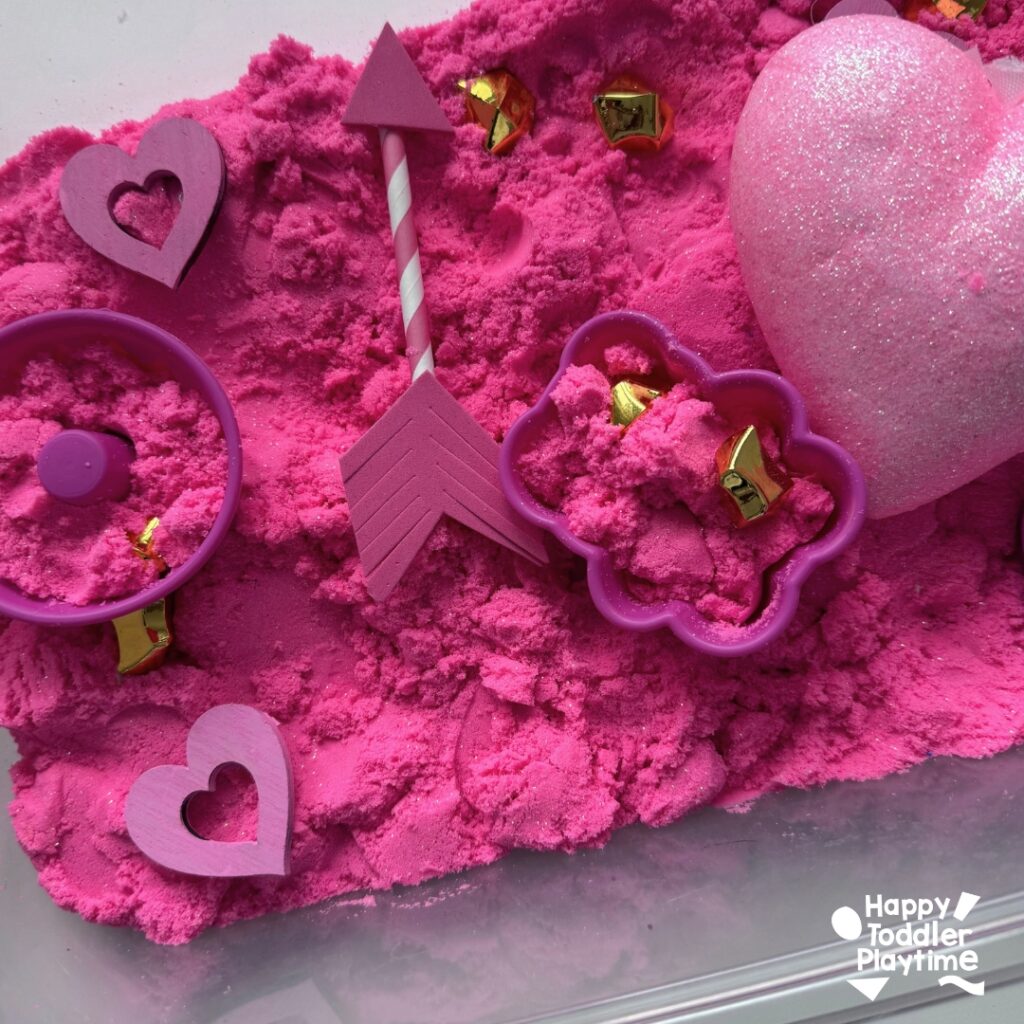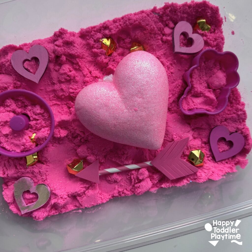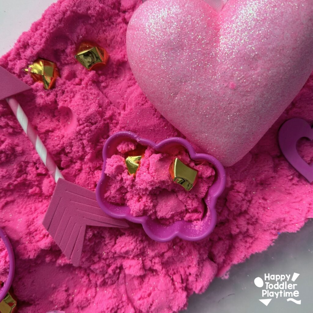 - Pour pink kinetic sand into the sensory bin and spread it evenly across the bottom. Use heart molds to press shapes into the sand for added texture.