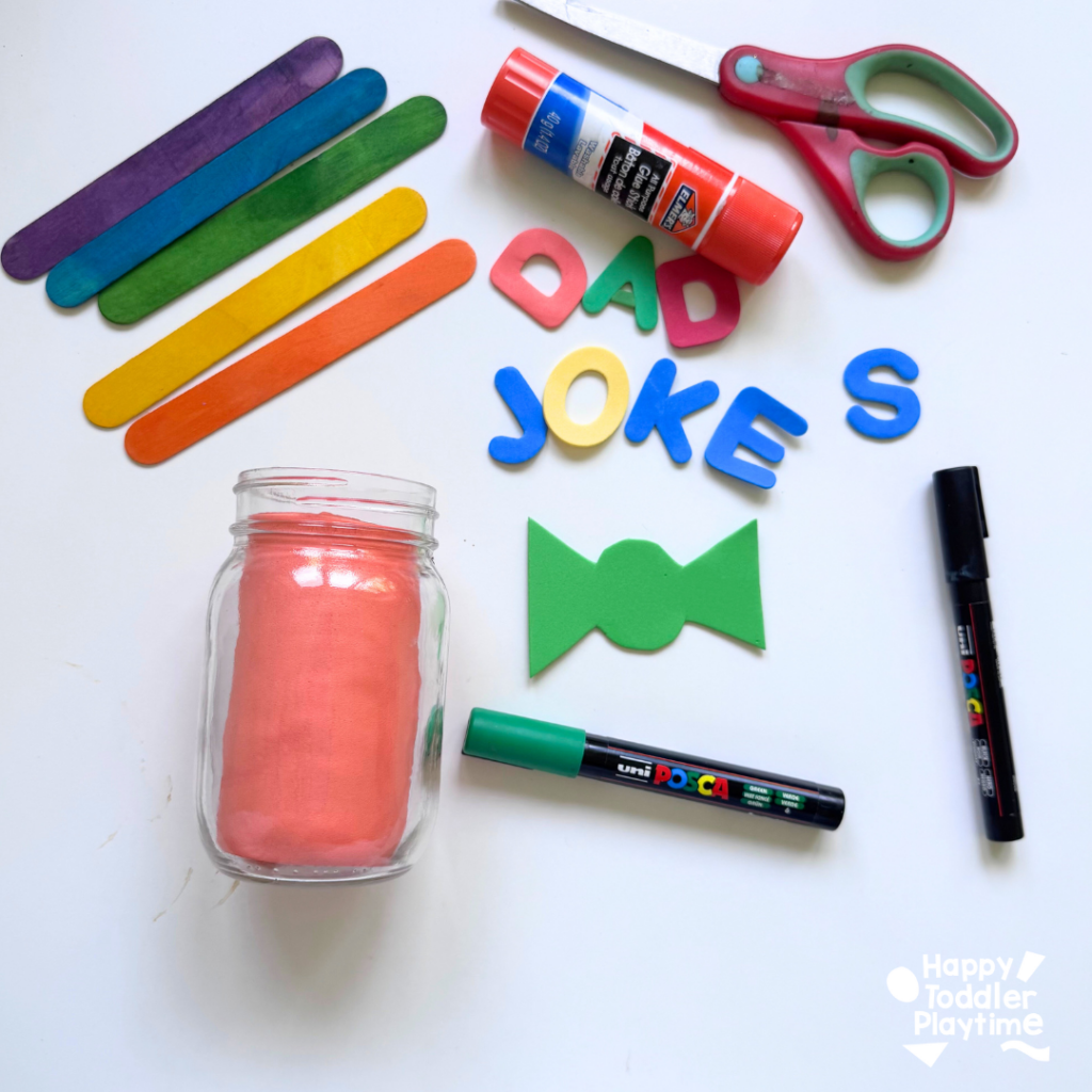 - Cut a strip of foam sheet to wrap around the inside of the jar. Next cut two strips of foam sheets. Then use a marker letter stickers to spell out “DAD JOKE JAR” across the label. Let kids go wild with decorating! Add stars, smiley faces, mustaches, or even little drawings of Dad’s favorite things. Glue them to the middle of the jar.
