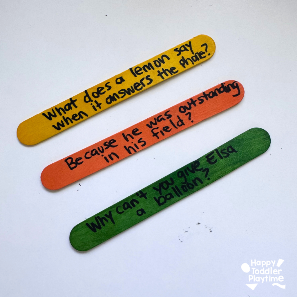 - Make the joke sticks: Use craft sticks for a more sturdy, popsicle-style look, or cut strips of white paper to fit inside the jar. Aim for 2-5 jokes depending on the age of your child. Older kids can write out the jokes themselves, while younger ones can dictate them for you to write. Want to keep things simple? Google a few clean, kid-approved dad jokes to get started. A few classics: