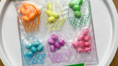 - Preschoolers: After adding drawn eggs on the bag, my preschooler was challenged to match the foam eggs to the corresponding colors drawn on the bag. This added an exciting twist of sorting and color recognition to their play.