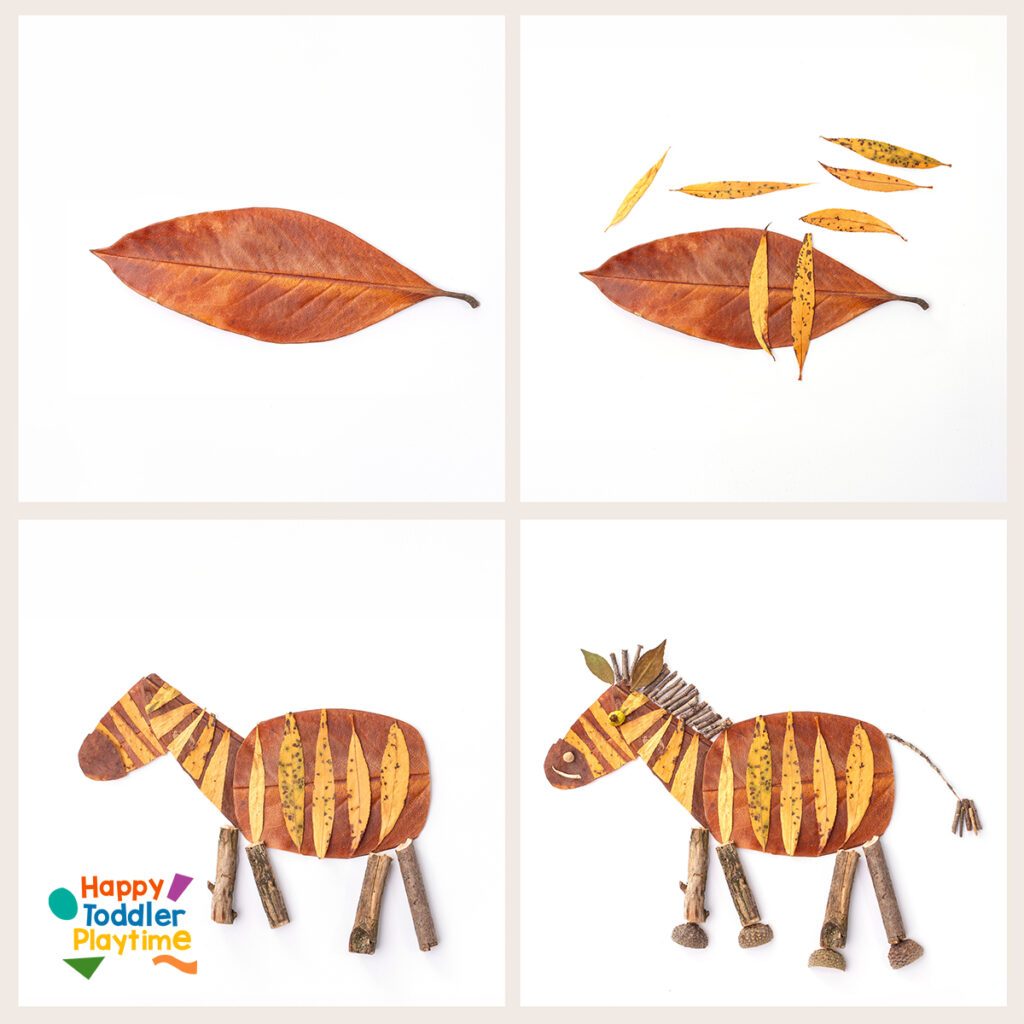 - Assemble the animals: Lay out your leaves and twigs on a sheet of paper or cardstock. Once you’re happy with the arrangement, either use double-sided tape or glue to attach the leaves and twigs in place. Double-sided tape is great for a mess-free option, but glue might be better for heavier materials like twigs. You can also add small details like feathers, tails, and legs using twigs or additional leaves.