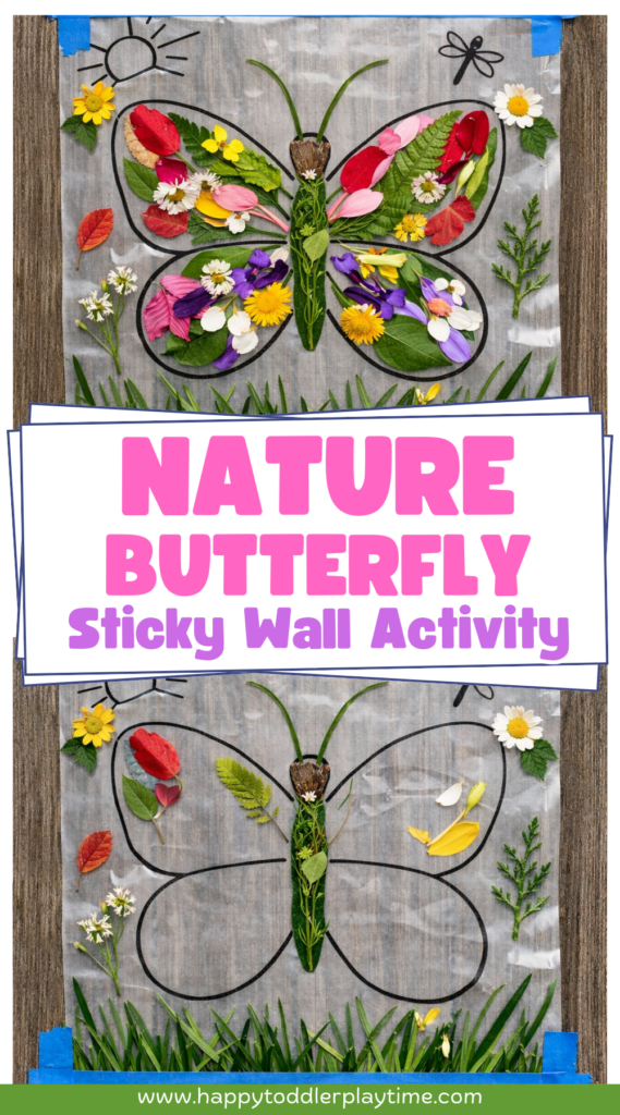 AHEAD: Create a beautiful butterfly craft using items found in nature! This nature butterfly sticky wall craft is a fun and easy summer and spring craft for kids!