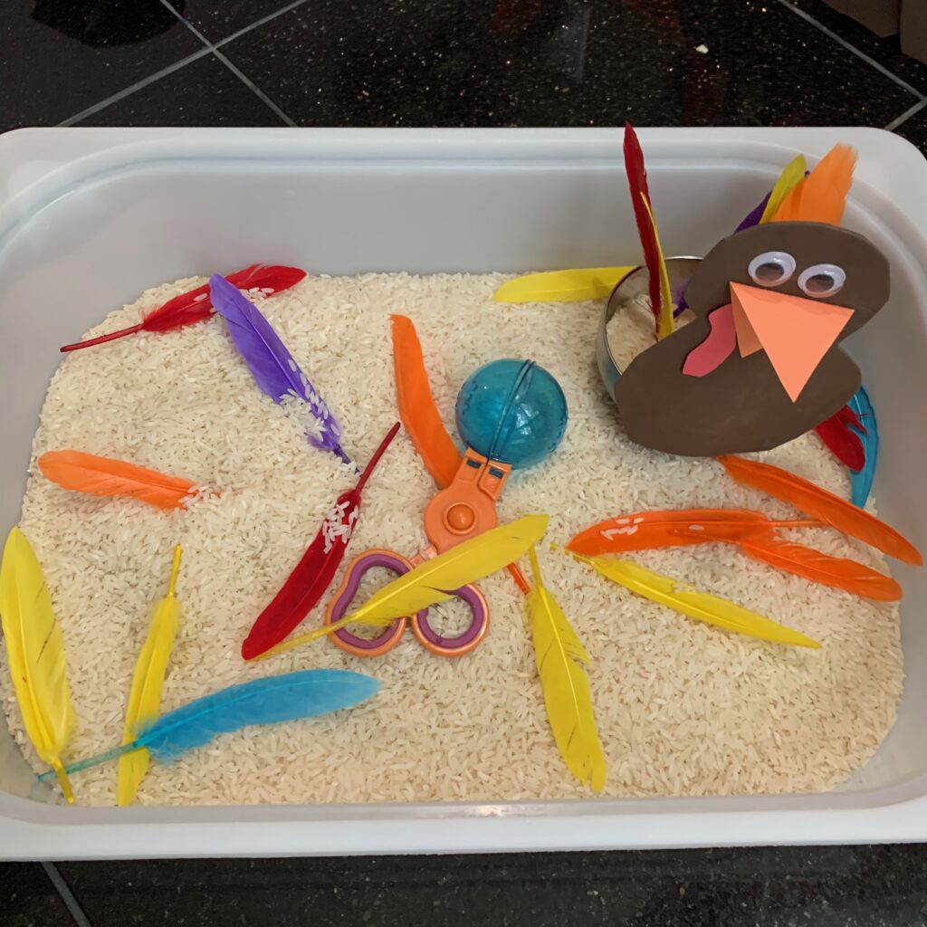 This sensory bin brings the fun of Thanksgiving dinner to playtime, filled with pretend food items like mini pumpkins, cranberries, and corn for kids to explore. It’s a playful way to introduce little ones to the idea of a Thanksgiving feast while encouraging tactile exploration and imaginative play.