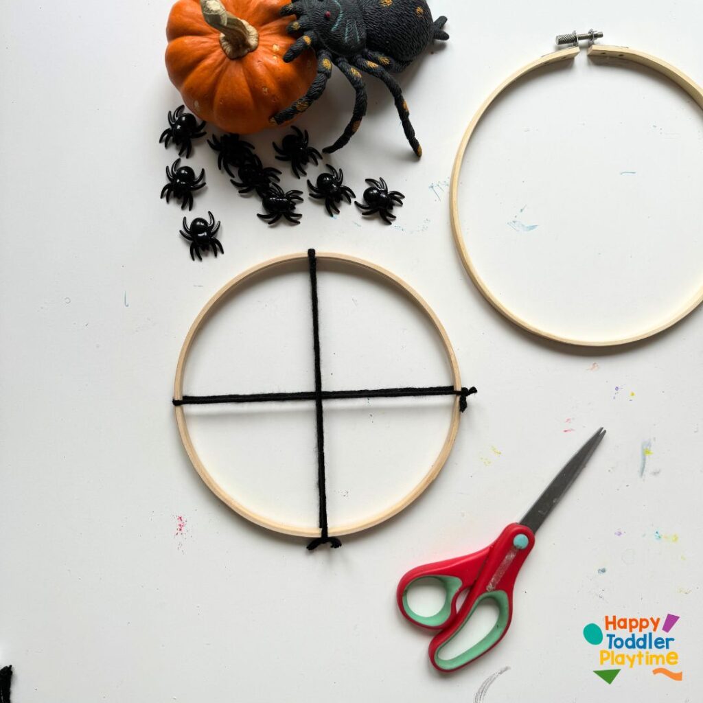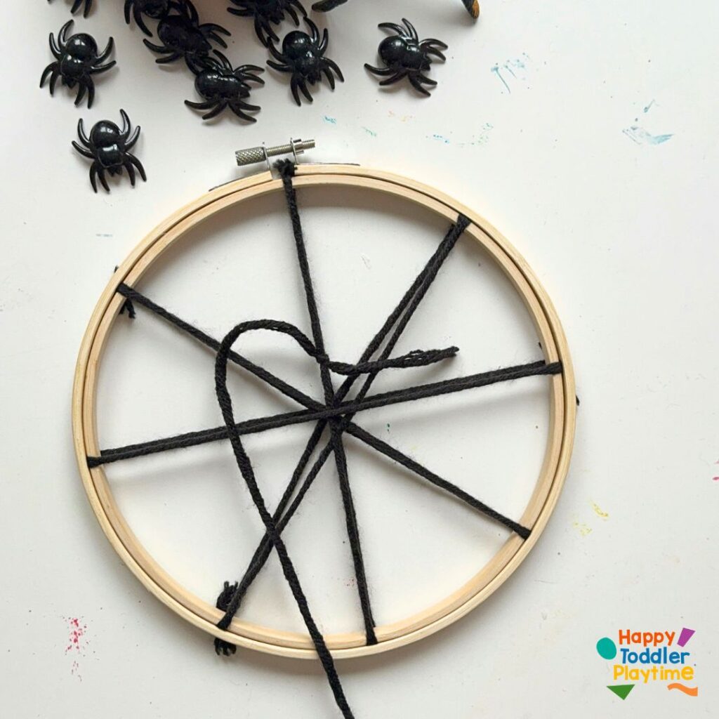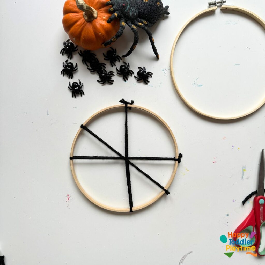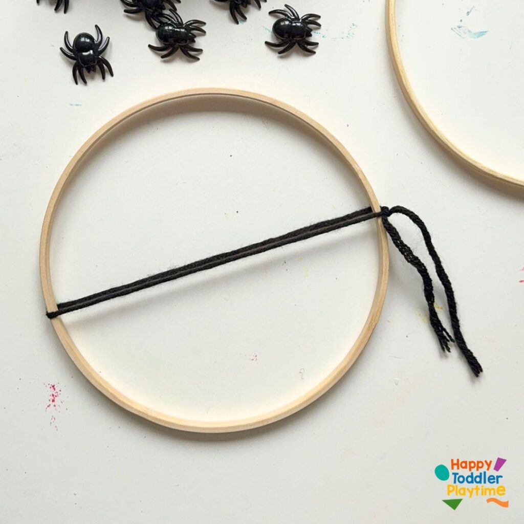 Take a long piece of yarn (about twice the diameter of the hoop) and cut and tie one end securely to the hoop. This will be the beginning of your web design. Don’t worry if it looks simple at first; it will take shape as you add more layers.